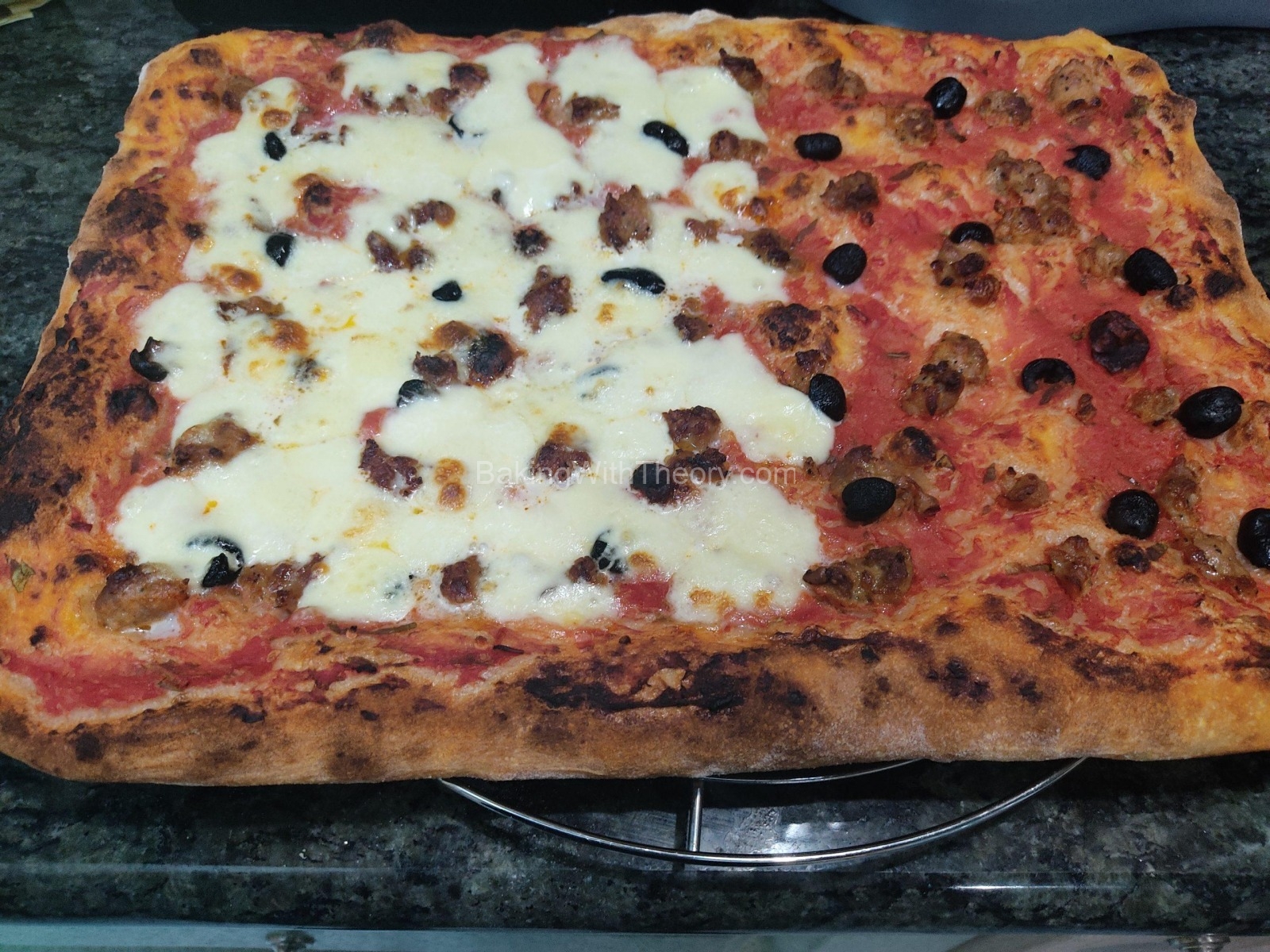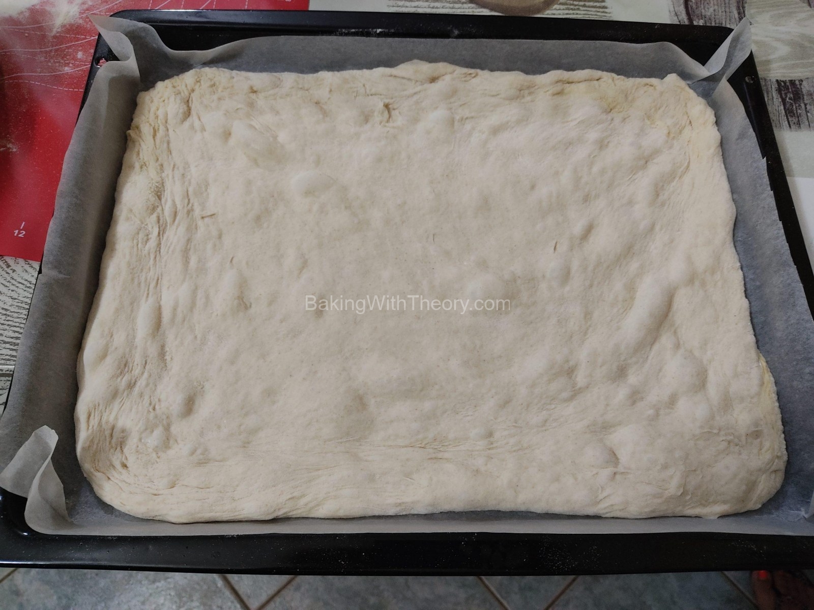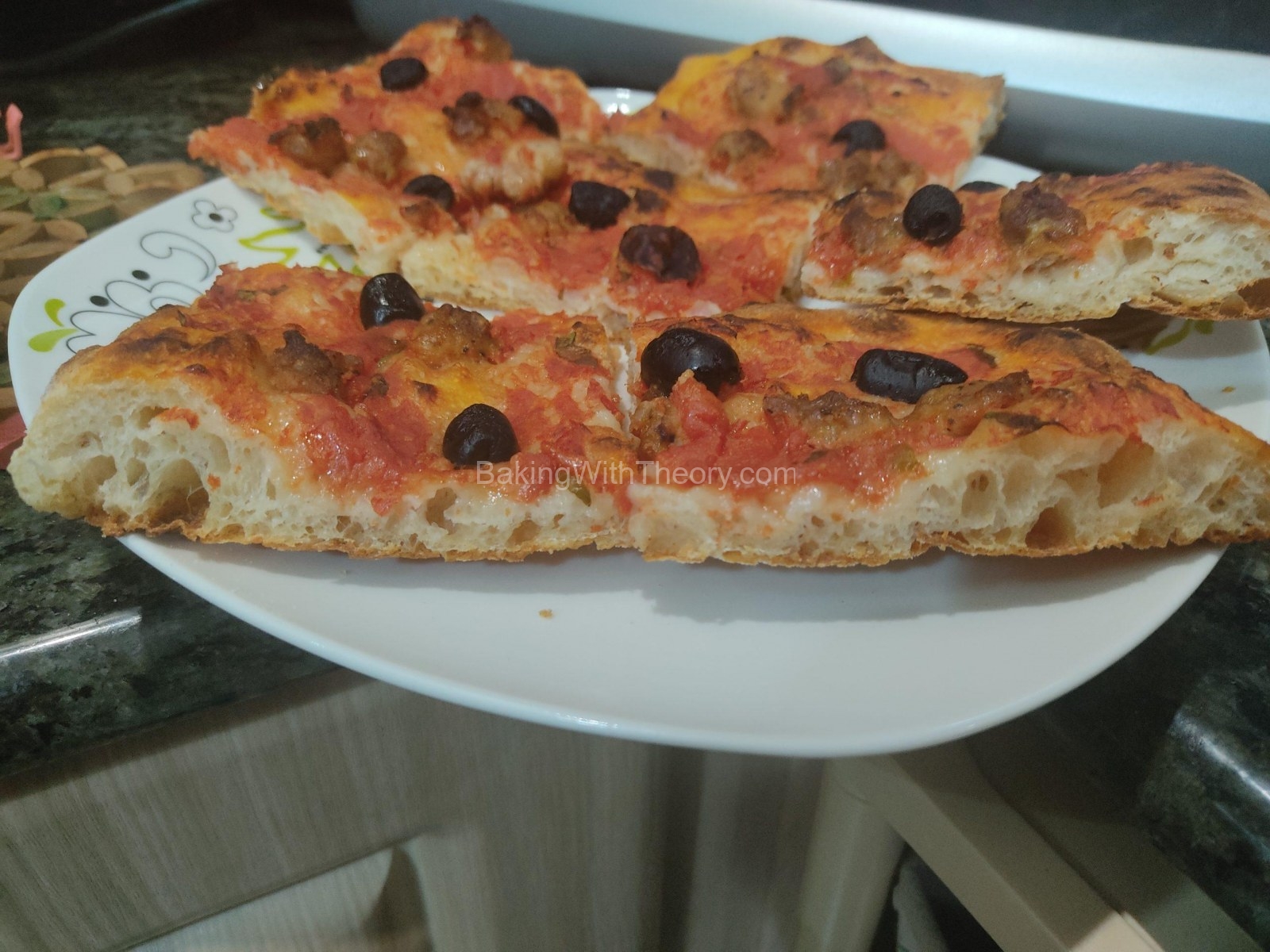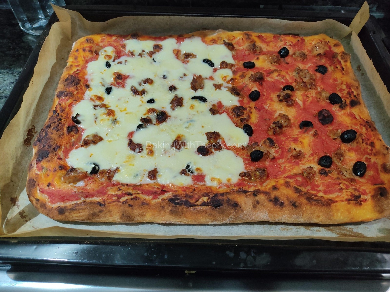 When it comes to pan pizza, probably the best known is the Roman Pan Pizza. In Rome this is sold thin and crusty for the traditional, called also “Scrocchiarella” as it makes cracks sound when you bite it. It can be higher for the modern or gourmet versions. The best tray’s material for cooking it is called Blue Iron but if you don’t have you can use any tray with oil or also with baking paper.